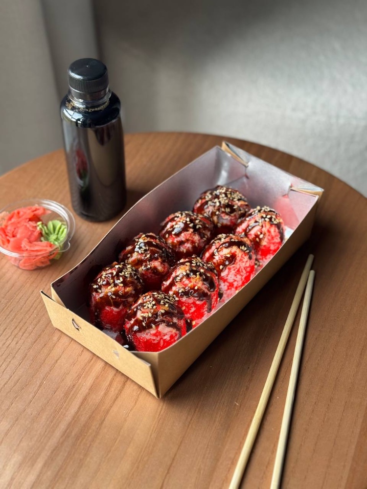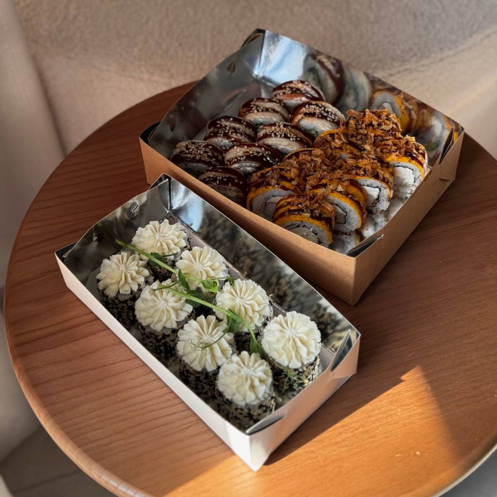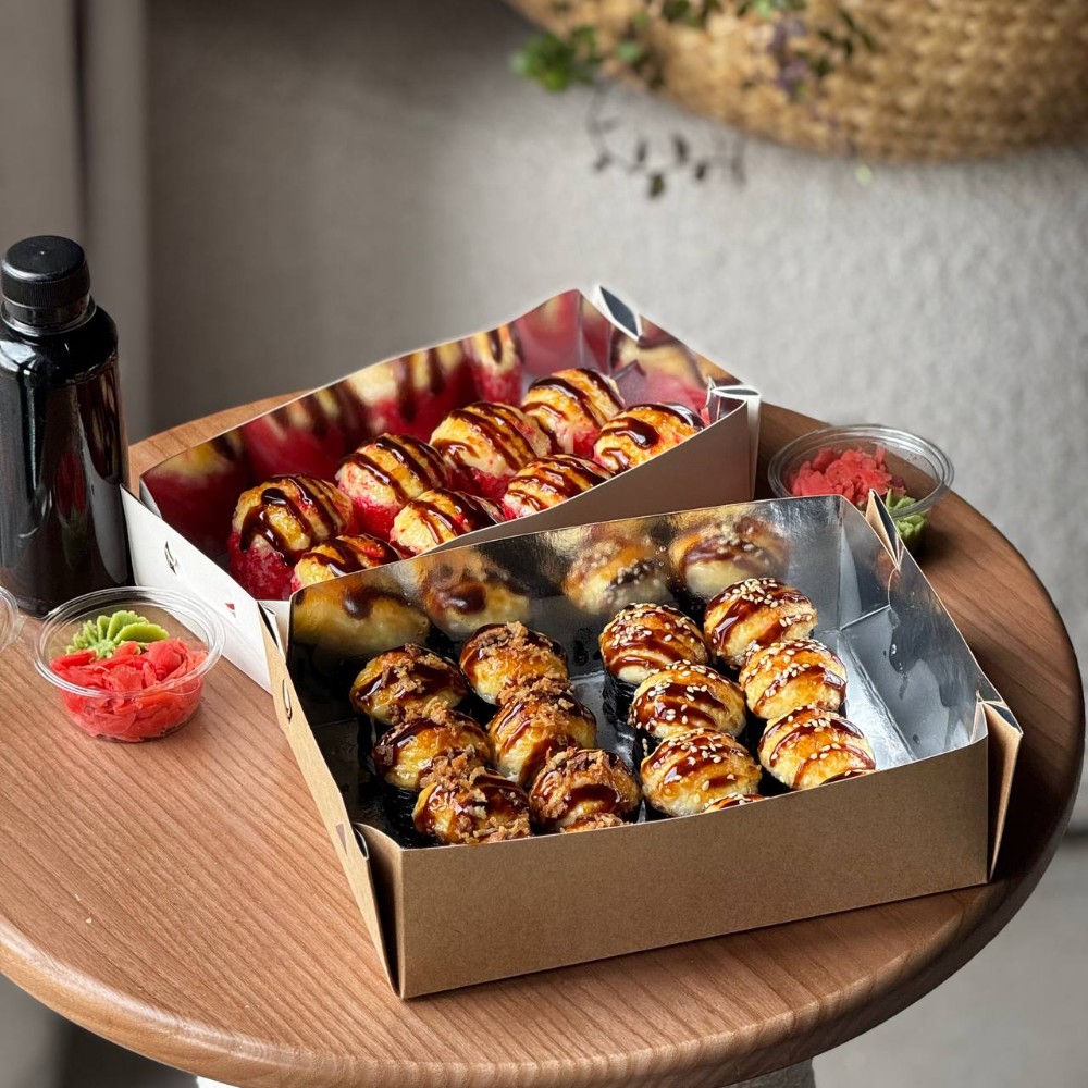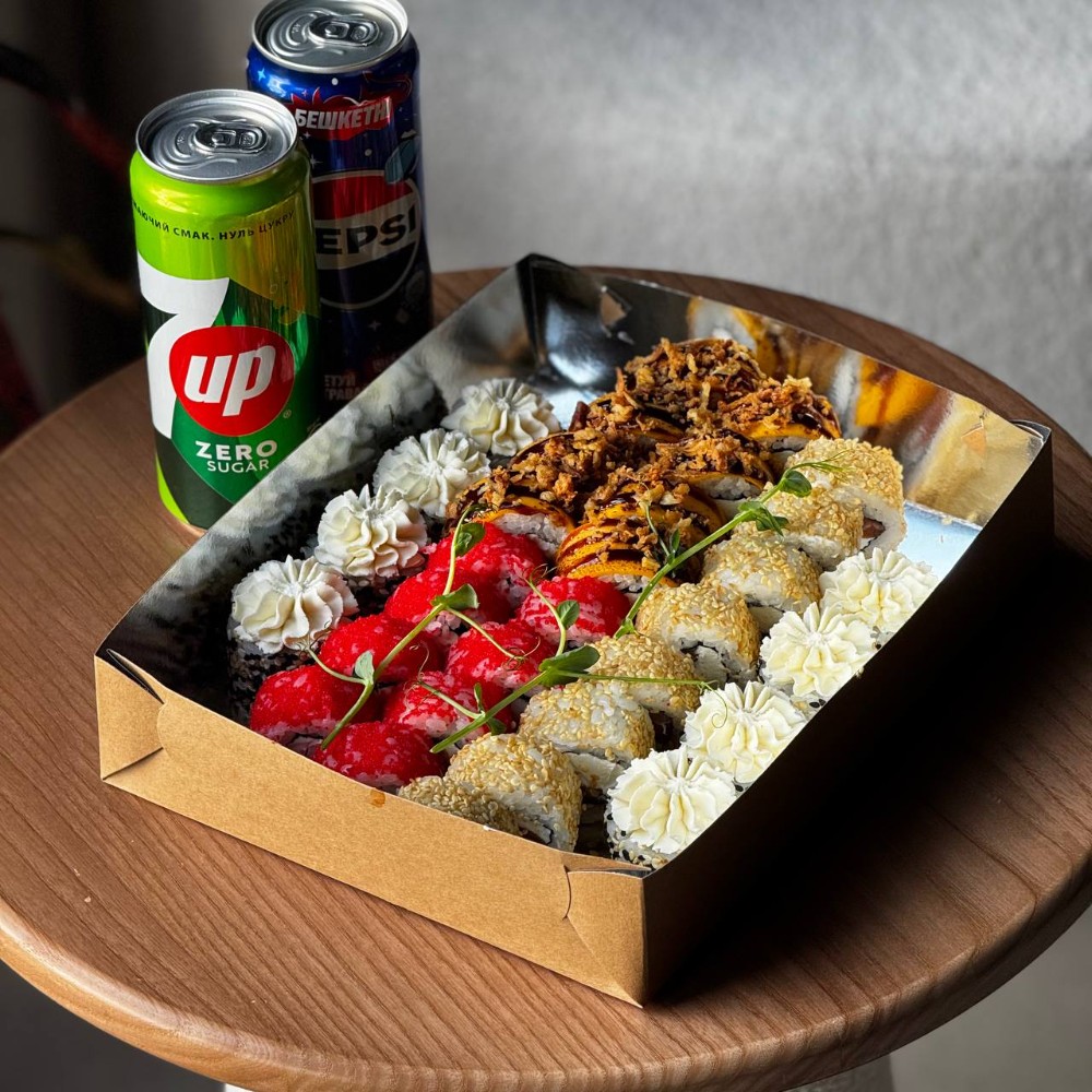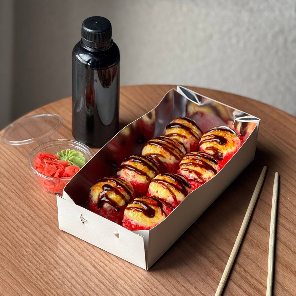 Рис; Вершковий сир; Ікра; Ананас; Креветка; Сирна шапочка; Унагі соус; Кунжут мікс.