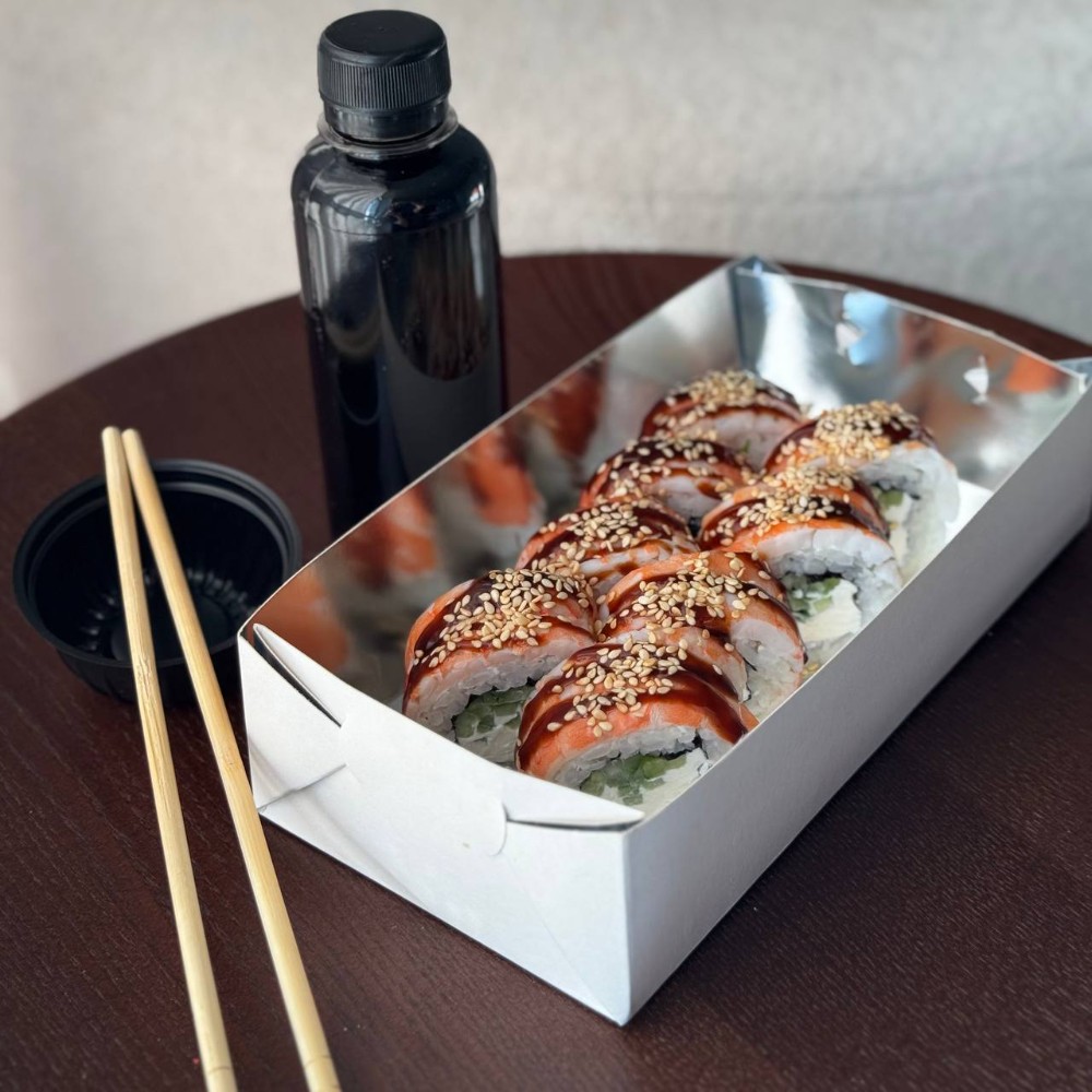 Рис; Вершковий сир; Лосось гриль; Сирна шапочка; Унагі соус; Цибуля фрі.